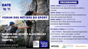 18 novembre 2025Maison des Sports Alice Milliat – 44 rue Romain Rolland, 44100 NantesDe 13h30 à 17h00Entrée libre et gratuite Un après-midi pour découvrir les métiers du sport Le Forum